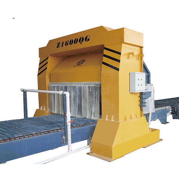 首先是通過Z1600QZ流水線切割機,進行第一次成品切割,Z1600QZ流水線切割機是采用金剛石刀頭,德國進口鋼片制成的刀片精致而成經久耐用。進行完第一次流水線切割后,通過90翻轉機對坯體進行水平方向90度旋轉,改變切割方向。再通過扳倒機對改變過方向的坯體進行翻倒,然后輸送給Z800QG切割機,進行第二次成品切割。